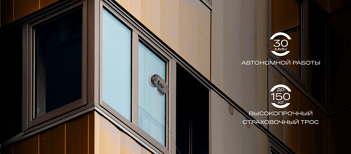 Встроенный вакуумный двигатель создает вакуум в 2600 Па и помогает надежно закрепляться на поверхностях, а система бесперебойного питания предотвращает падение робота с окна даже при отключении электроэнергии в течение 30 минут. Высокопрочный страховочный трос выдерживает до 150 кг.