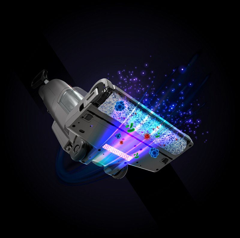 Atvel F16 Pro оборудован лампой УФ-стерилизации. Ультрафиолетовая лампа разрушает ДНК вирусов и бактерий и является полностью экологичной, в отличие от бытовой химии. Лампа автоматически отключается при отрыве пылесоса от пола во избежание попадания излучения на человека или животных. Данная функция особенно полезна в домах с маленькими детьми и домашними животными.